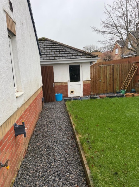Firstly, the LED floodlights significantly improve visibility along the side access of the property. This makes it safer for the homeowner to walk along the pathway at night and clearly see the garden and outbuilding area.