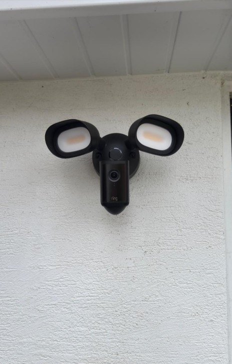 To improve visibility and security, we installed a modern LED floodlight with an integrated Ring security camera, providing powerful lighting and smart monitoring in one unit.